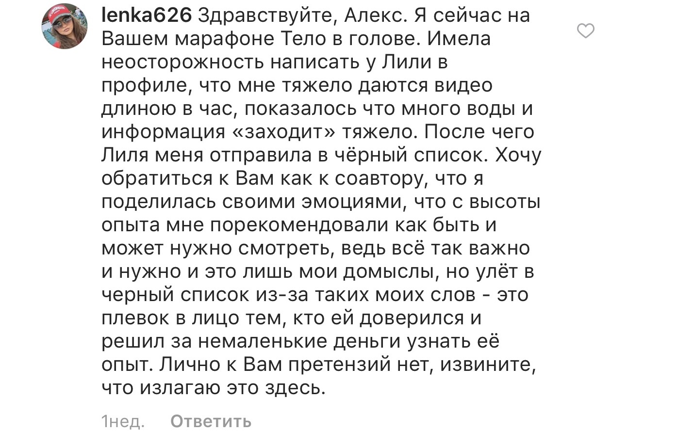 «Три урока по 40 минут — запороты по причине х***вого звука. Под третьим видео даже "извинения", типа да, мы запороли звук, но мы выдаем такую ох*****ую информацию, что перезаписывать не будем. Я написала в поддержку, что как бы курс за 100 евро не должен быть с такими косяками. В ответ они мне великодушно добавили еще "бонусных уроков", где Лиля делает "силовые" с резинкой».