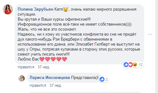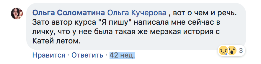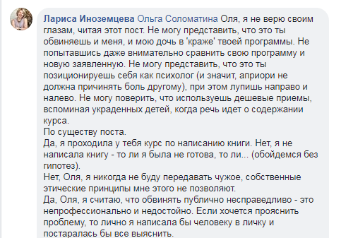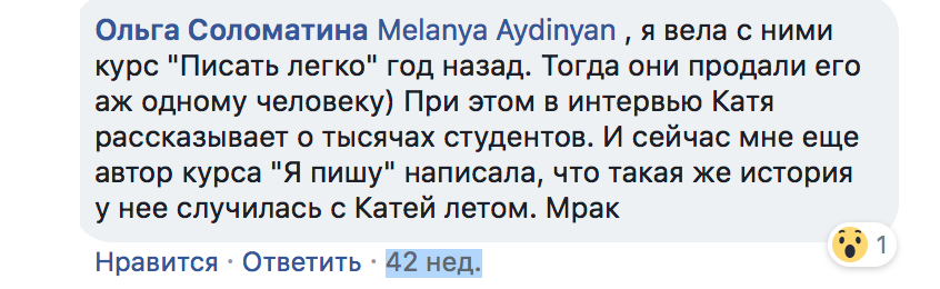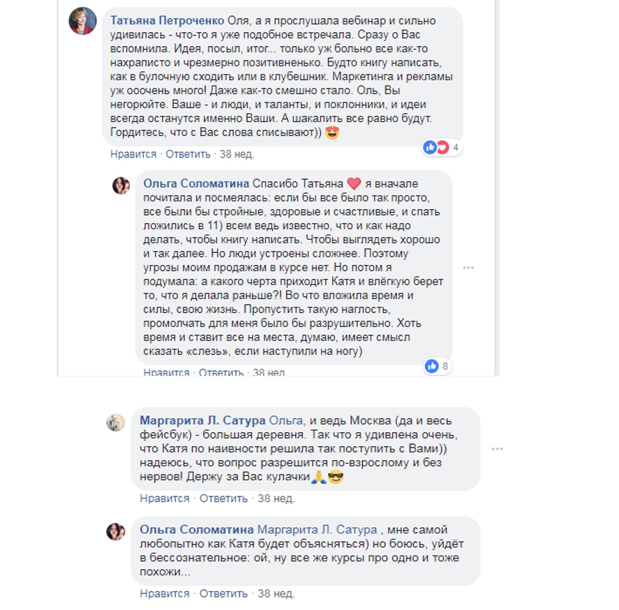 В декабре 2017 года известный журналист, писатель и автор курса по писательскому мастерству Ольга Соломатина написала на своей странице в Facebook о том, что у нее украли курс, и она не знает, как действовать в этом случае. Эмоциональный пост собрал множество комментариев. Читатели поддерживали, сочувствовали, рекомендовали знакомых юристов.