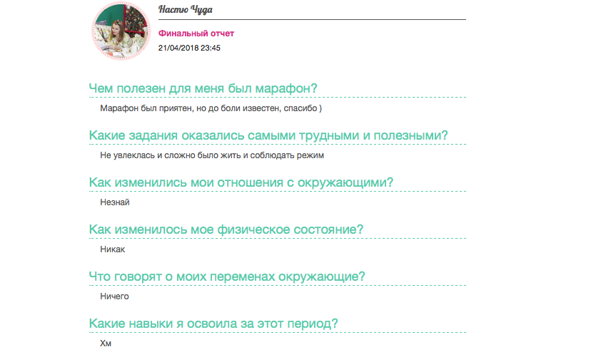 Я подошла к данному мероприятию ответственно, все пропускала через себя, «вправляла» себе мозги, но я просто не выдержала этого потока заданий и практик, совершенно не связанных между собой, не имеющих причинно-следственных связей. В итоге мой итог участия в марафоне: полный бардак в мыслях, планах, стремлениях.