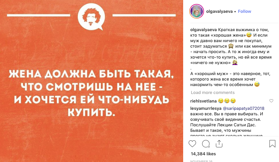 Если обратиться к сути, то главное письменное и невербальное инстаграмного послания Ольги к потенциальным клиентам заключается в том, что, научившись правильно накапливать женскую энергию и передавать ее любимому мужчине через бескорыстное служение, они смогут получить взамен его уважение, любовь, привязанность и деньги. Особенно деньги.