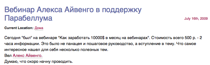 Эго Ольги подлечилось созданием сайта valyaeva.ru, куда она в перерывах между помощью супругу, намыванием пола и сменой подгузников начала писать о своем опыте благостной жизни. Сам же Алексей параллельно с наемной работой сеошника вдохновился закопать свои пять золотых на парабеллумском поле чудес. Свое первое озарение он описывает в «ЖЖ»: