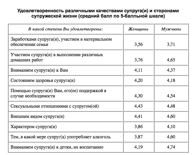 Если же спросить мужчин, то окажется, что те вообще-то категорически не согласны быть дойными коровами и предпочли бы равный вклад в семейный бюджет. Согласно исследованиям Росстата больше всего семейные мужчины в своих женах не удовлетворены именно их материальным вкладом. Вот все хорошо, всем довольны: участием в бытовых делах, отношением к детям, вниманием, сексом и внешностью. Еще б зарабатывали наравне — вообще здорово могло бы быть! Но, увы, самое большое несчастье, которое русские мужчины видят в своих красавицах женах, — это их низкая либо отсутствующая вовсе зарплата.