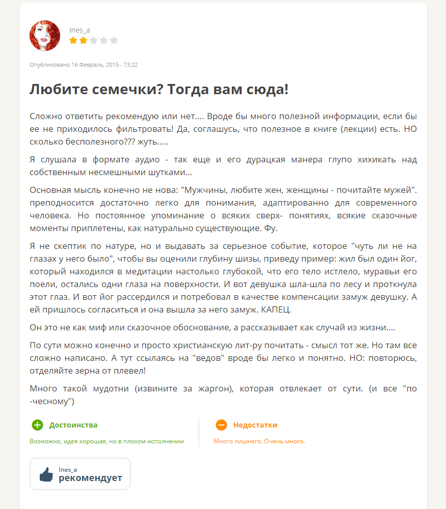 Кстати, договорились бы гуру уже между собой, что там в Ведах сказано относительно отдавания и получения энергии. А то у другого ведического пропагандиста, Рами Блекта, почему-то женские органы созданы как раз для того, чтобы получать энергию, а мужские — чтобы ее отдавать. И он тоже в своих лекциях ссылается на Веды.