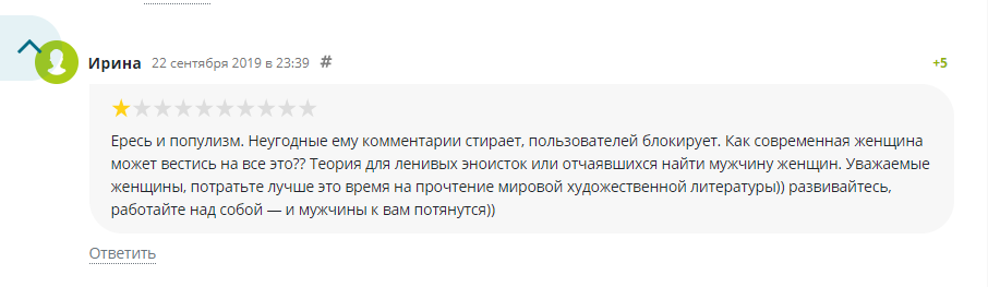 Встречался с девушкой год, хотели съехаться. Я кольца купил, думал сделать предложение через пару недель на 14 февраля. Девушка насмотрелась этих лекций и начала активно применять в жизни. Как итог — после года отношений она заявила мне: я тебя больше не кормлю, не обнимаю, на порог не пускаю и т. д. Все после свадьбы. Теперь ты должен год минимум меня добиваться наравне вон с теми моими ухажорами и т. д. и т. п.