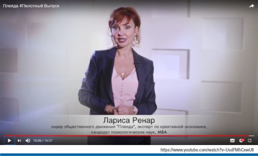 Вероятно, Лига имеет какое-то отношение к еще одному политическому проекту Ренар — общественному движению консолидации креативных и интеллектуальных сил общества «Плеяда», который Лариса создала еще перед выборами в 2017 году. С программой желающие могли ознакомиться на YouTube (741 просмотр). Спойлер: роботы заменяют людей; то, что было фантастикой, становится реальностью и кошмаром.
