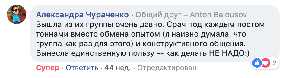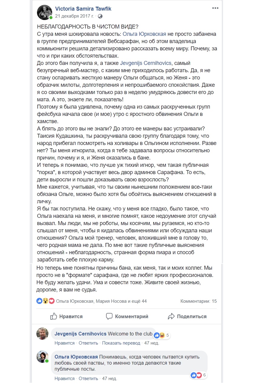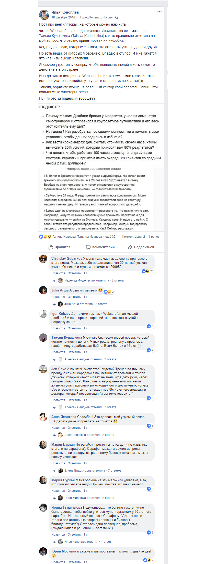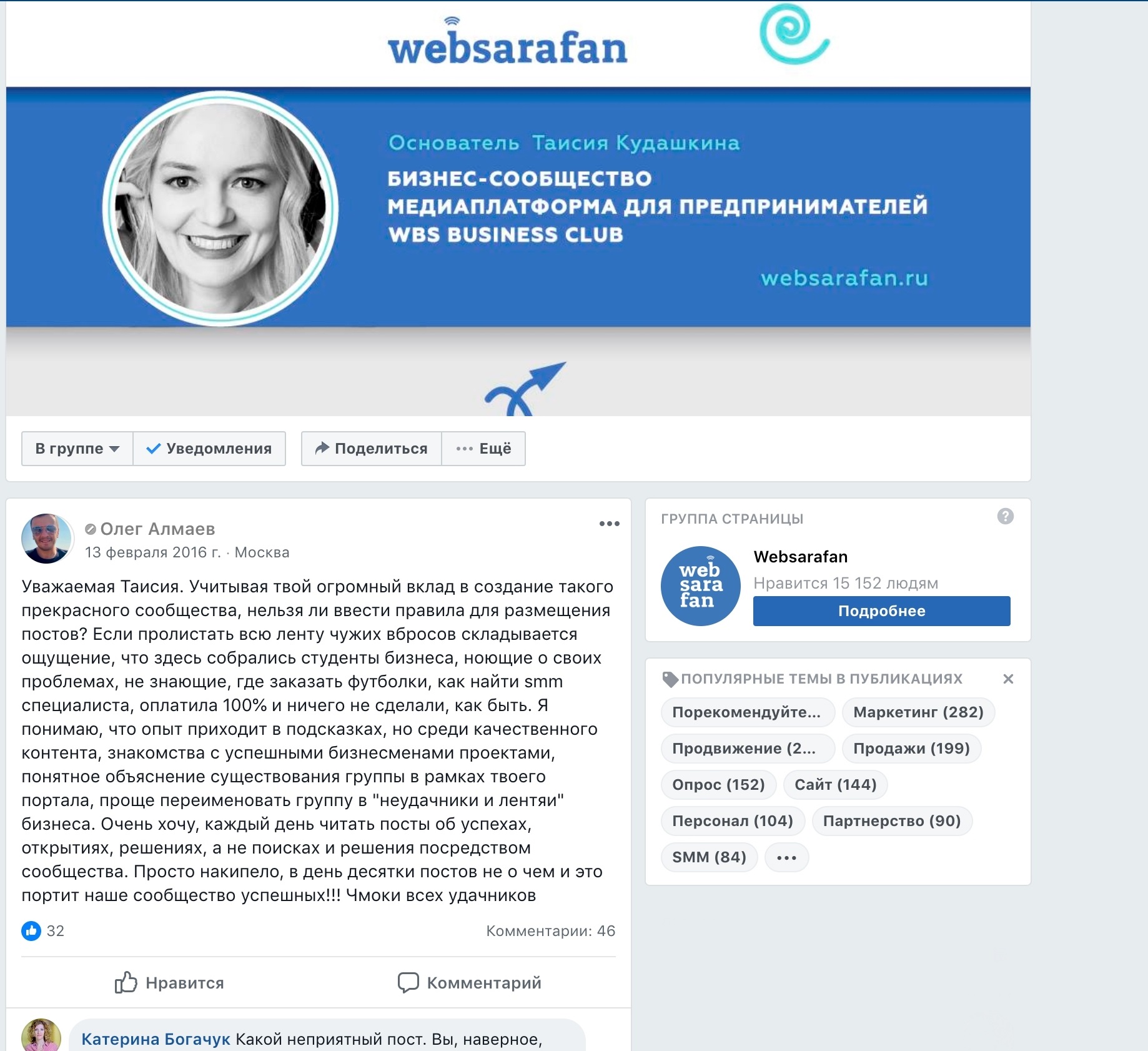 Через некоторое время вполне пригодный стартап начал приходить в упадок. Таисия, так гордящаяся тем, что у нее «самая большая группа предпринимателей», как-то умолчала о том, что как таковых экспертов и реальных бизнесменов в проекте больше не осталось. Зато все больше стали появляться посты в духе «подскажите, где купить полотенца для отеля» или «как лучше делать SMM». Оскорбления перешли в ранг нормы в комментариях. Уровень «экспертов» тоже скатился до самого дна, что стало заметно всем, кроме, естественно, администрации «Сарафана».