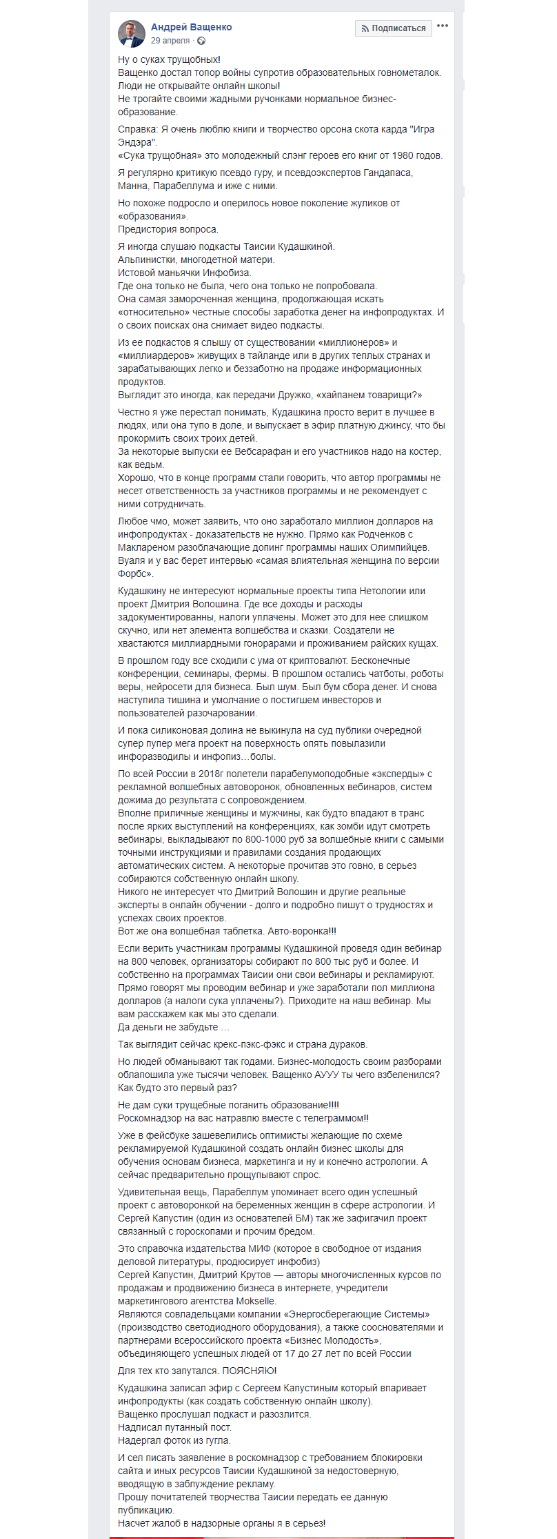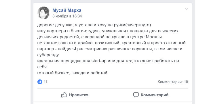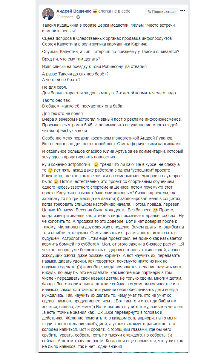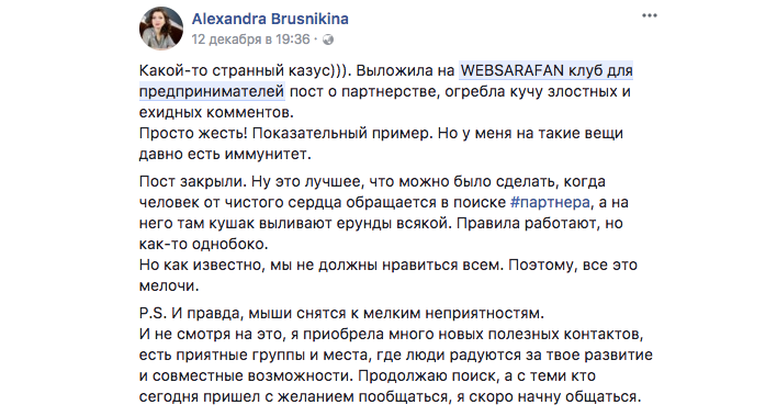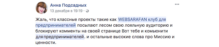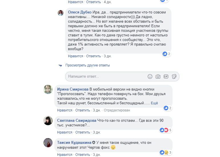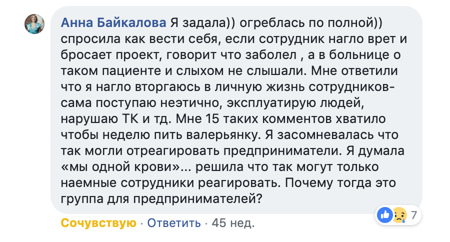 Через некоторое время вполне пригодный стартап начал приходить в упадок. Таисия, так гордящаяся тем, что у нее «самая большая группа предпринимателей», как-то умолчала о том, что как таковых экспертов и реальных бизнесменов в проекте больше не осталось. Зато все больше стали появляться посты в духе «подскажите, где купить полотенца для отеля» или «как лучше делать SMM». Оскорбления перешли в ранг нормы в комментариях. Уровень «экспертов» тоже скатился до самого дна, что стало заметно всем, кроме, естественно, администрации «Сарафана».