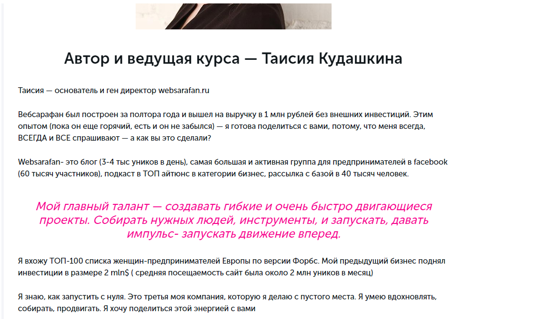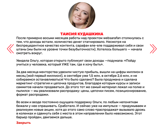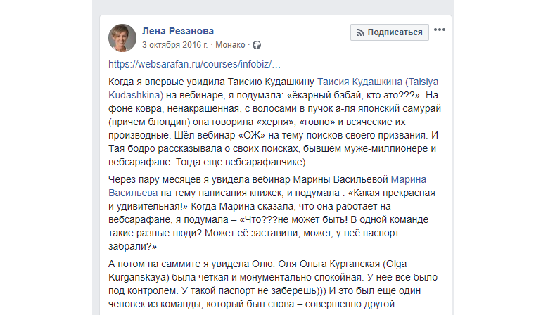 «Пару лет назад по рекомендации Ольги Юрковской я подписалась на группу Websarafan. Рекомендация Ольги для меня многое значила, я была подписана на ее платную полугодовую рассылку по инфобизнесу и каждый раз приятно удивлялась, насколько адекватные комментарии, рекомендации и советы Ольга дает.