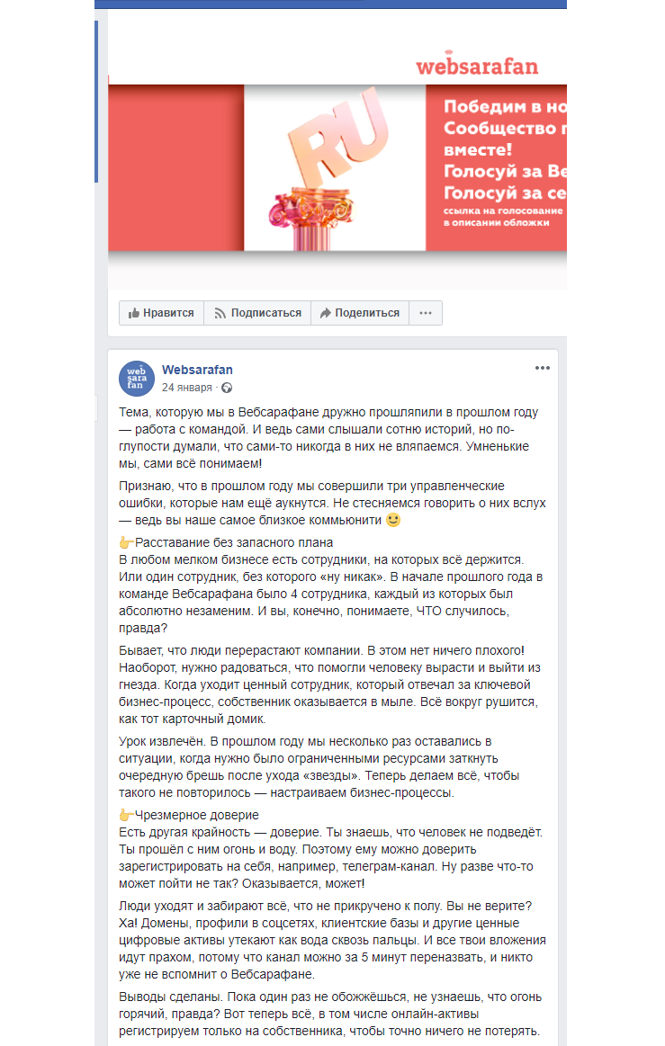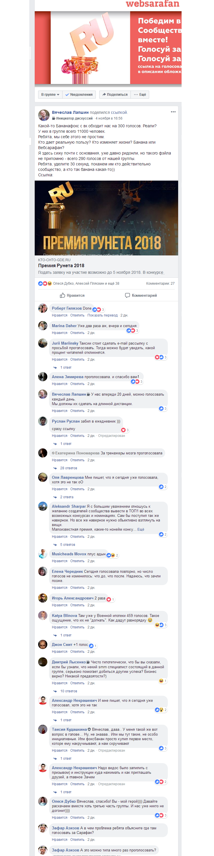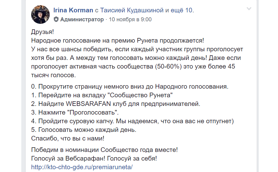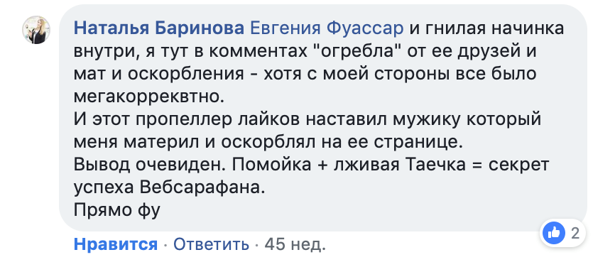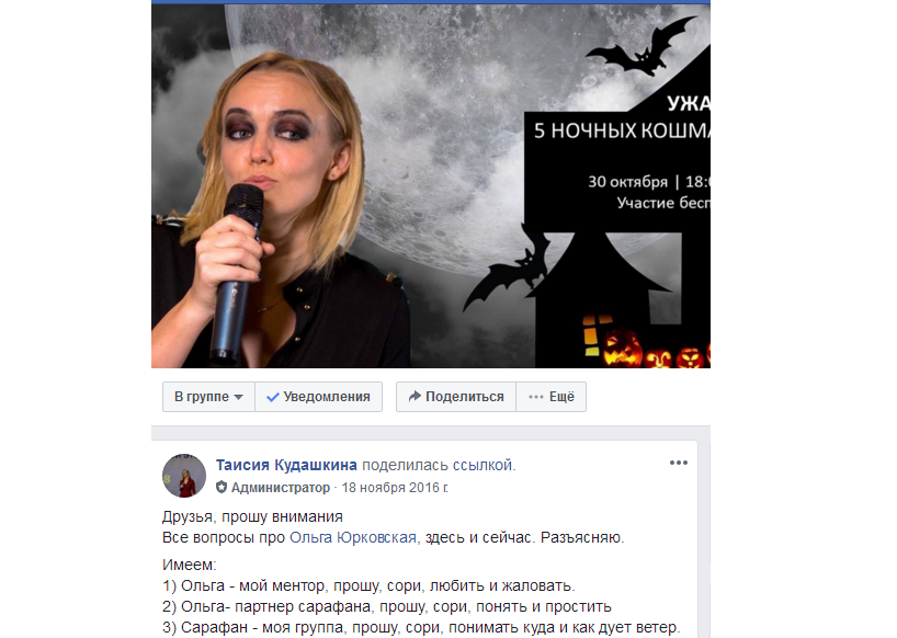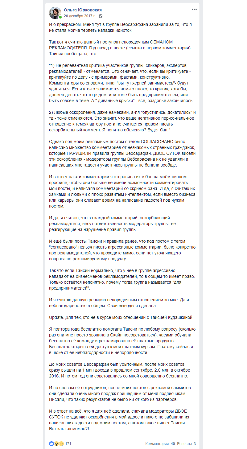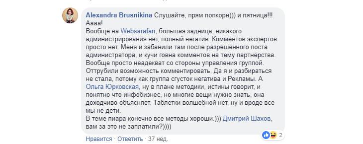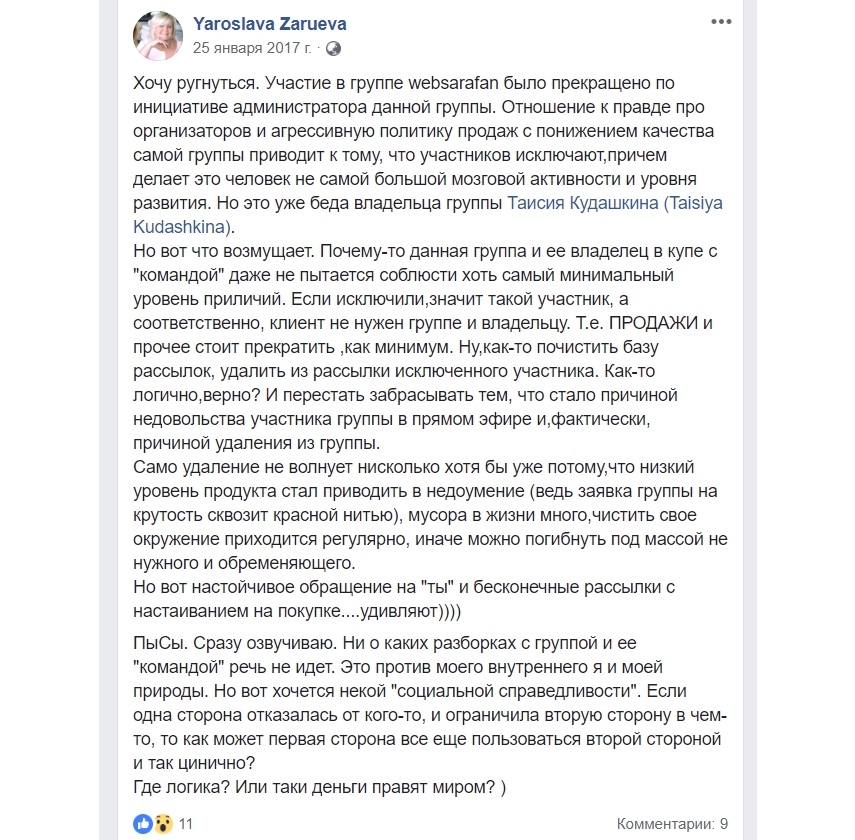 Ольга в то время активно "раскручивала" Websarafan в базе своих подписчиков, потому что выступала коучем основательницы группы Таисии Кудашкиной. Таисия много раз писала об этом в группе.