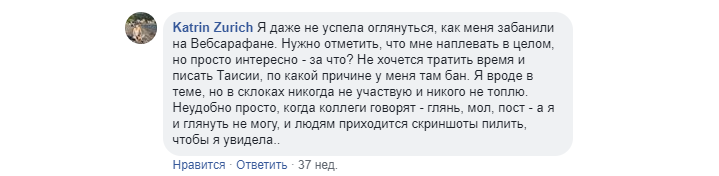 «Мне кажется, основная проблема сообщества — это проблема в неправильном подходе к модерации. И в том, что теперь Таисия пишет про какие-то несовпадения взглядов и так далее, на самом деле виноваты плохие работники. Я была и администратором, и модератором (и главным модератором) не одной площадки. Если модераторы не реагируют мгновенно, не учат пользователей, как можно и как нельзя себя вести, не наказывают и не предупреждают сразу после нарушения, то за сутки любая ситуация может превратиться в отвратительнейший холивар. Где уже на личности перешли все, даже самые изначально правые и этичные, — потому что они видят, как при молчании администрации их оскорбляют, — и сами начинают восстанавливать справедливость. А этим должна заниматься команда модераторов. Тогда и пользователи дрессируются, кстати, и повышают культурный уровень.