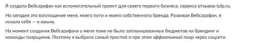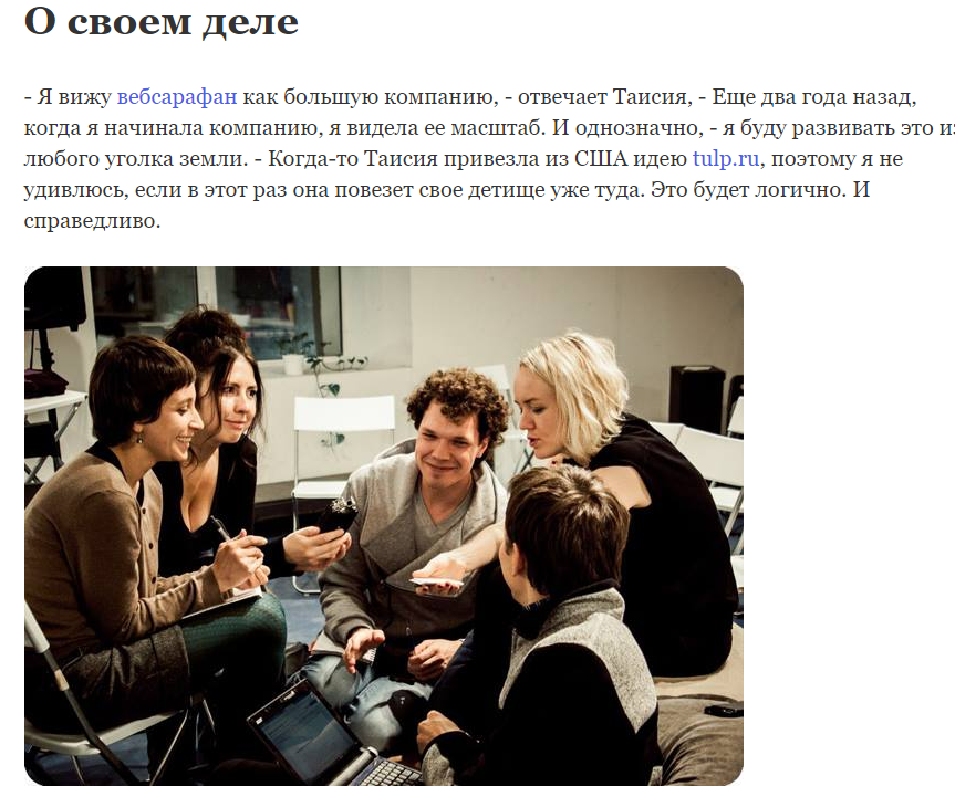 И снова откровенная ложь. «Вебсарафан» начал свою работу на инвестиции из проекта Tulp. К сожалению, Таисия страдает выборочной забывчивостью — что мы еще неоднократно увидим.