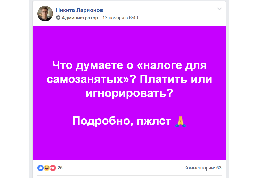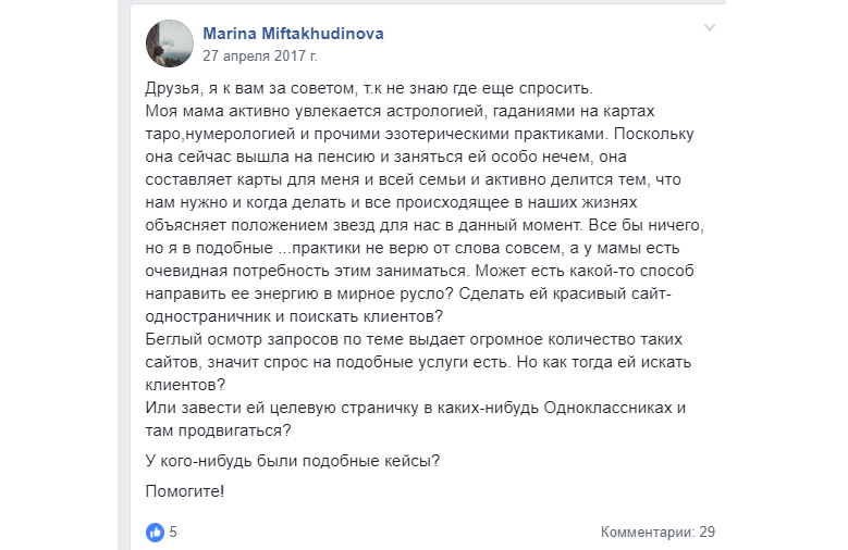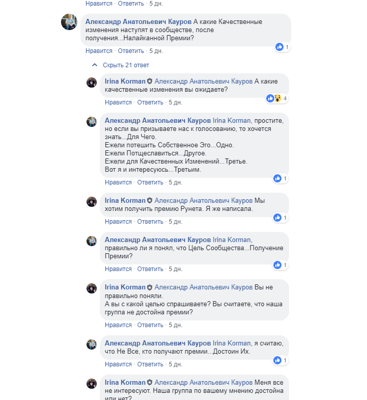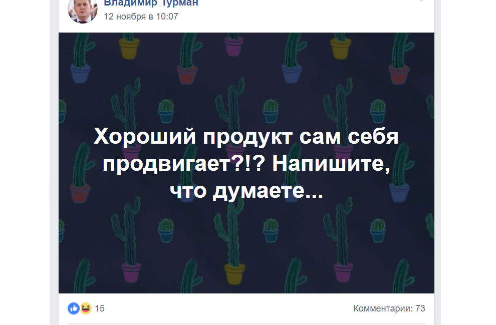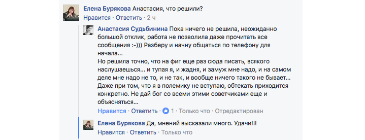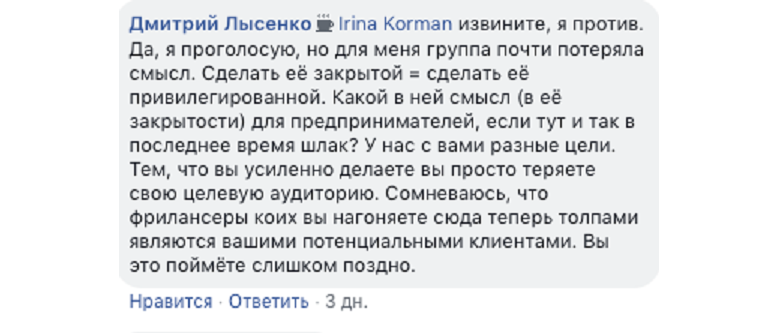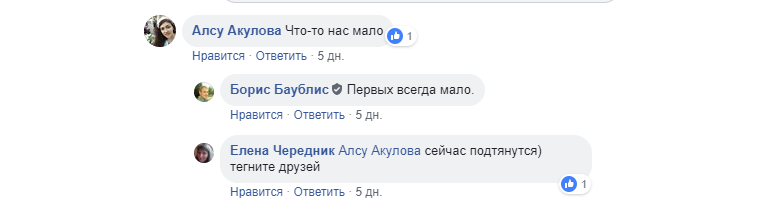Кстати, на тему количества. Попытки сделать перекличку в группе в тот момент на 20+ тысяч человек показывали, что на пост откликаются не более 500. Это меня заставляло задуматься, как и то, что количество лайков на публикацию было всегда очень немного, всегда до сотни, а чаще всего до десятка. Я недоумевала — как такое может быть, если у меня на личной странице лайков на порядок больше, а друзей нет и тысячи?
