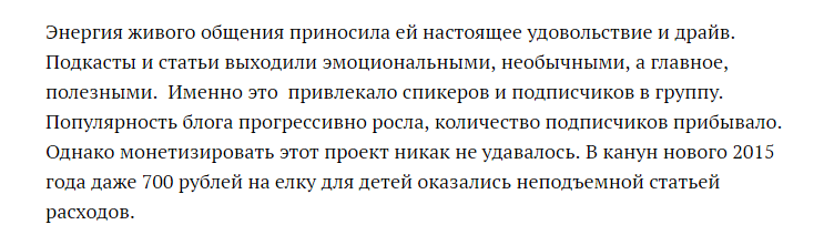 У меня также не получилось поверить в то, что паблик зарабатывает деньги. Для меня в какой-то момент стало очевидно, что продукты "Сарафана" покупает ничтожный, минимальный процент аудитории.