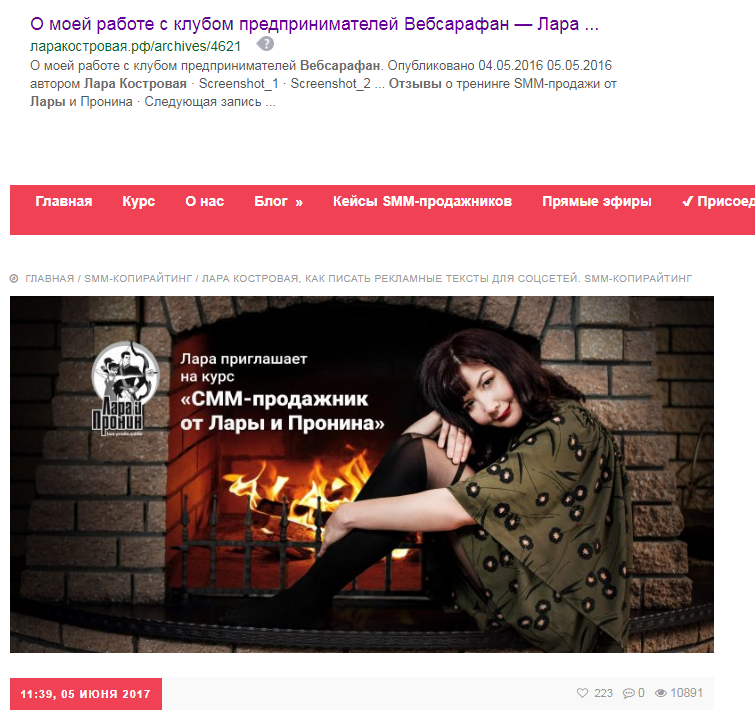 И тут вовсе начинаются мистика и странности. Google демонстрирует наличие в поисковом индексе отзыва Лары о ее работе с «Вебсарафаном» и даже ссылку на эту страницу. Но при переходе на нее мы попадаем совсем на другой адрес и другую тему — совершенно безобидную публикацию Лары об SMM-продажнике. Стоило бы задаться вопросом — почему и отсюда так поспешно убрали материал?