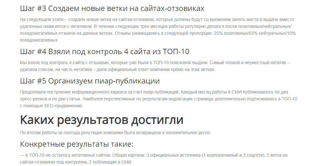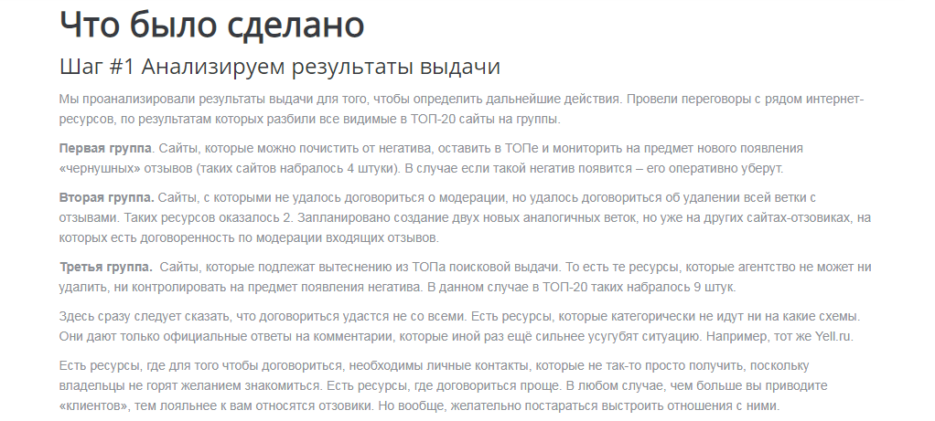 А разгадка очень проста: на сайте «Репутацци» описана схема, по которой из поисковой выдачи удалялось все, что так или иначе связано со скандальным крахом платформы, потерявшей всех своих спикеров и базовых сотрудников. Алгоритм зачистки был описан в деталях.