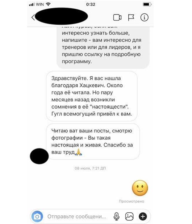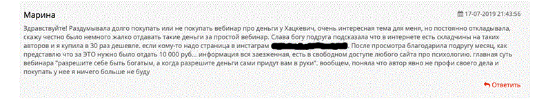 «Я была у нее 2 года назад на индивидуальной встрече. Стоило это 10.000р тогда. Слышала о Хацкевич давно, общалась с одной из ее бывших подруг и та, очень плохого мнения о ней (подробностей не рассказала). Захотелось мне взглянуть на нее воочию...
