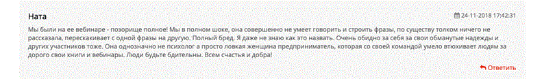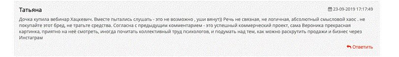 «Вебинар и консультация. И уже после оплаты попала на ее вебинар в прямом эфире в инстаграме — уже тогда разочаровалась в ней) но решила, что все равно посмотрю вебинар и проконсультируюсь — работа тет-а-тет и на тысячу человек, как мне кажется, могут отличаться)) но нет — Вероника реально плохо говорит, плавает в некоторых вопросах, на неудобные вопросы не отвечает в принципе и много повторяет одно и тоже, в чем уверена видимо или что выучила от зубов) на личной консультации говорила тоже общими фразами, то есть никакого индивидуального подхода я не обнаружила. Но она все равно молодец, я с вами согласна. Раскрутилась мощно) а без лоха и жизнь плоха))».