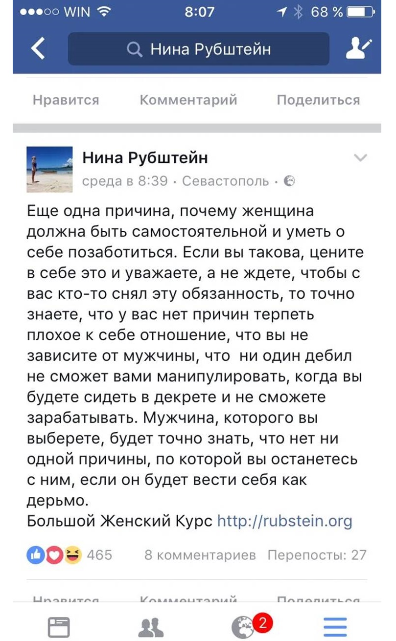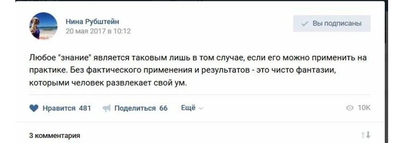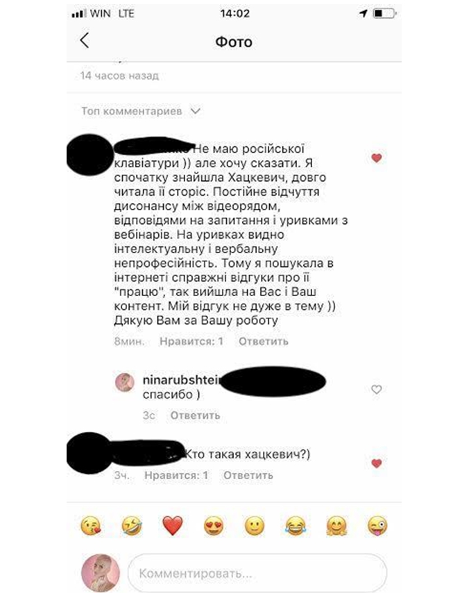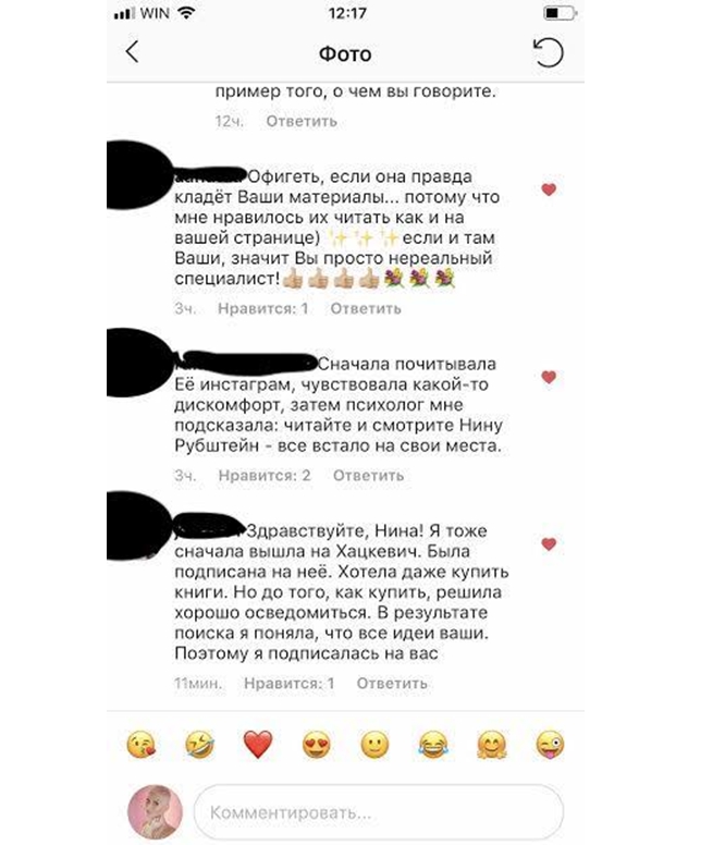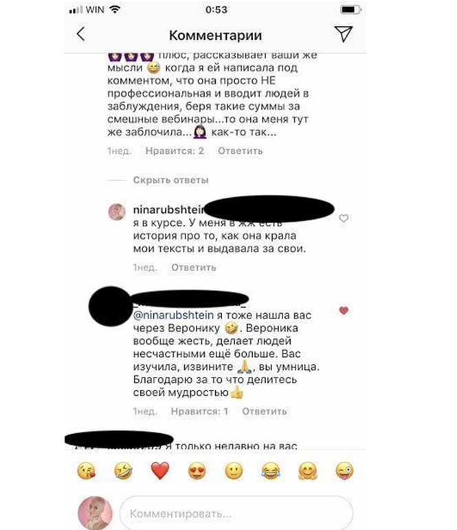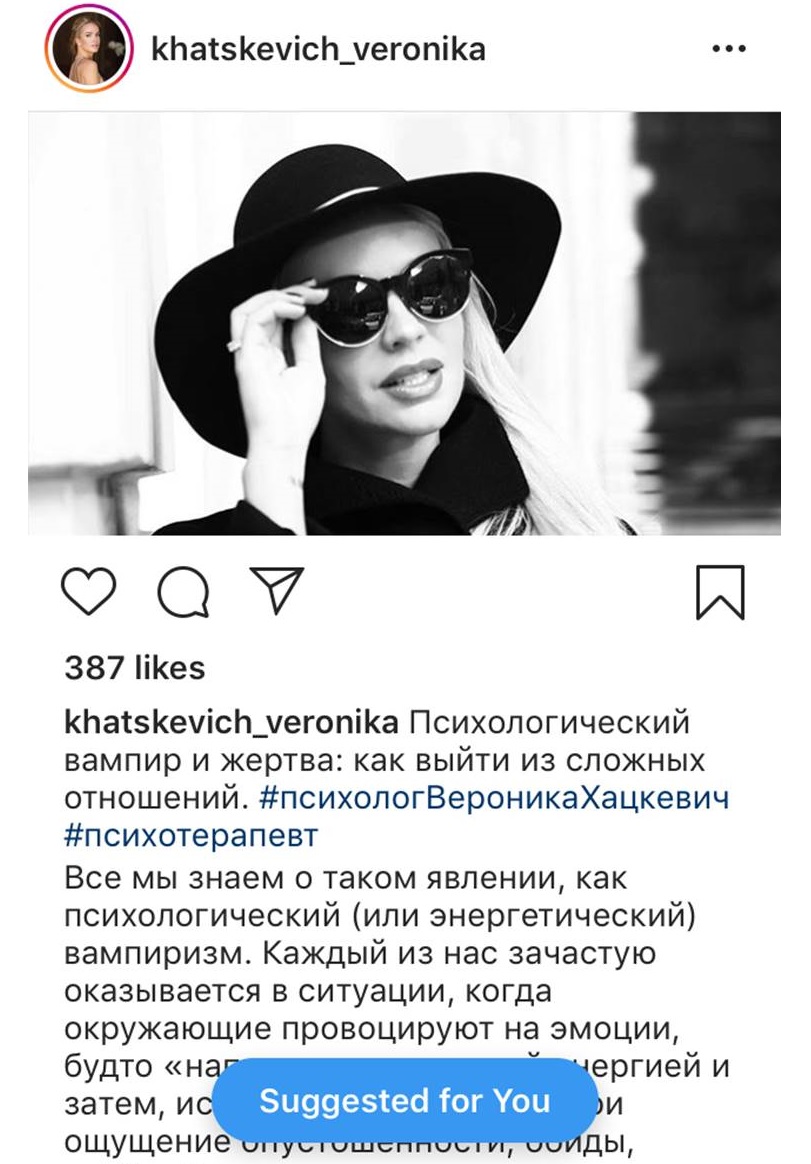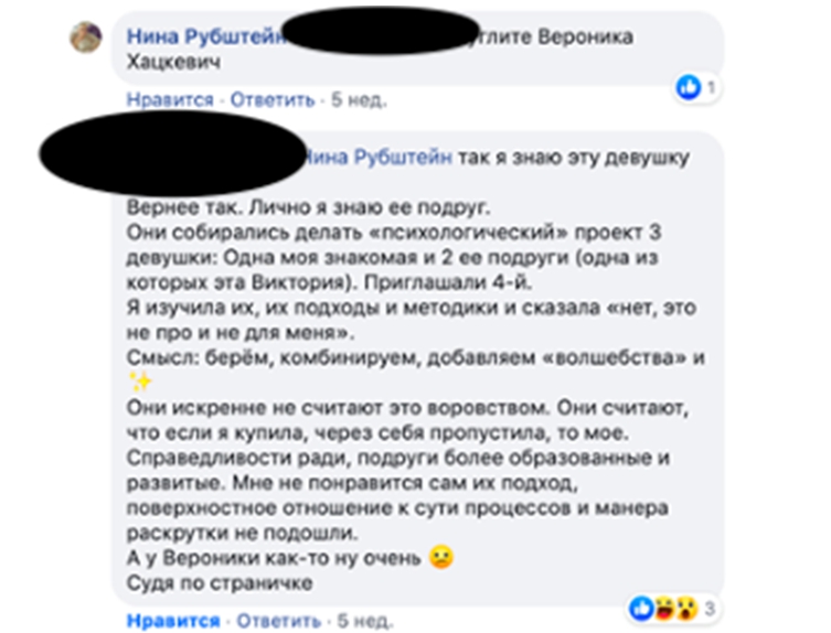 «Вчера мне сообщили (смотрите тремя постами ниже) о том, что мои тексты крадет некая Вероника Хацкевич, у которой десятки тысяч подписчиков. Я прошлась по ее аккаунту в “Инстаграме” и увидела: как минимум 70% ее постов — чуть обработанные копирайтером мои тексты. Остальные 30 — тексты моих коллег (пример смотрите по этой же ссылке). Мои читатели прошлись по ее лайкарям и выяснили, что это фабрика ботов. Позиционирует она себя как клинический психолог. Я, естественно, написала в “Инстаграм”, заполнила форму о нарушении интеллектуальной собственности, и через несколько часов все тексты, ссылки на которые я им прислала (но не все мои тексты, увы), были заблокированы» («ЖЖ» Нины Рубштейн).