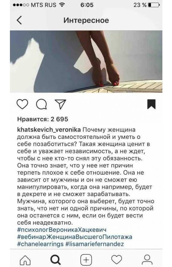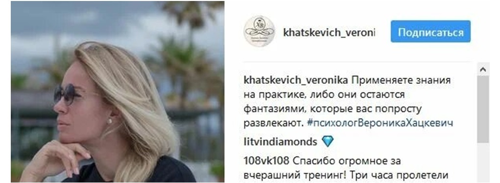 Кроме красивых фото, Вероника пишет посты, полные мудрости и полезных советов. Пишет книги о том, как стать женщиной высшего пилотажа, и, как водится, продает курсы и вебинары от 15 до 100 тысяч рублей. А часовая онлайн-консультация у Хацкевич стоит 60 тысяч рублей.