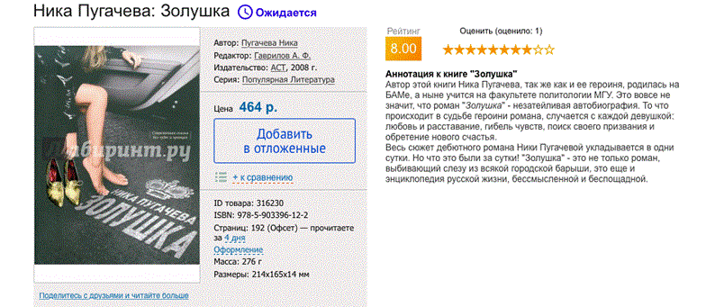Нашлась и та самая книга Вероники Хацкевич с весьма оригинальным названием — «Золушка». Хацкевич опубликовала ее в 2008 году под псевдонимом Ника Пугачева. Это история о приключениях девушки из провинции, которая решилась покорить Москву, а оказалась в постели бандита.