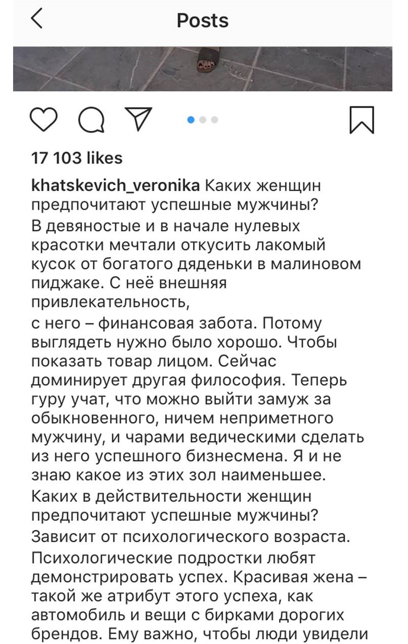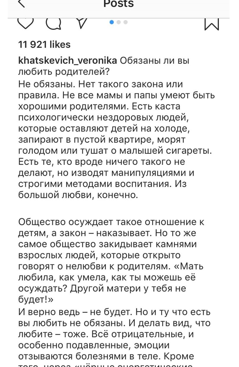 А у Вероники Хацкевич в «Инстаграме» 17 ноября того же года появляется пост с подозрительно похожим содержанием.
