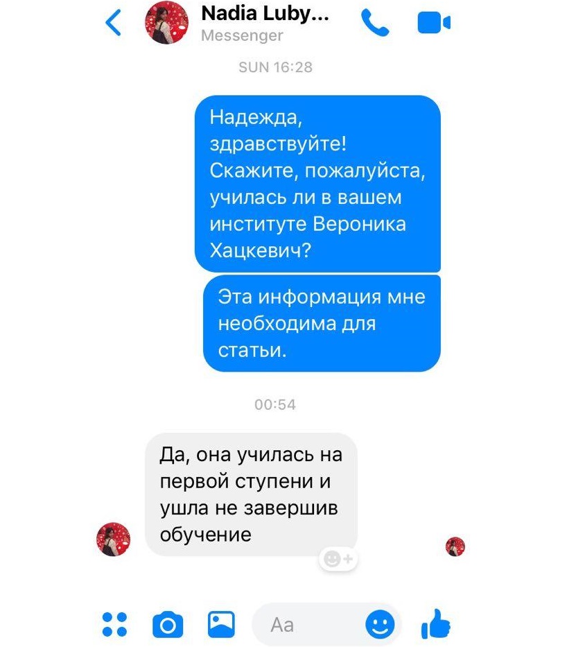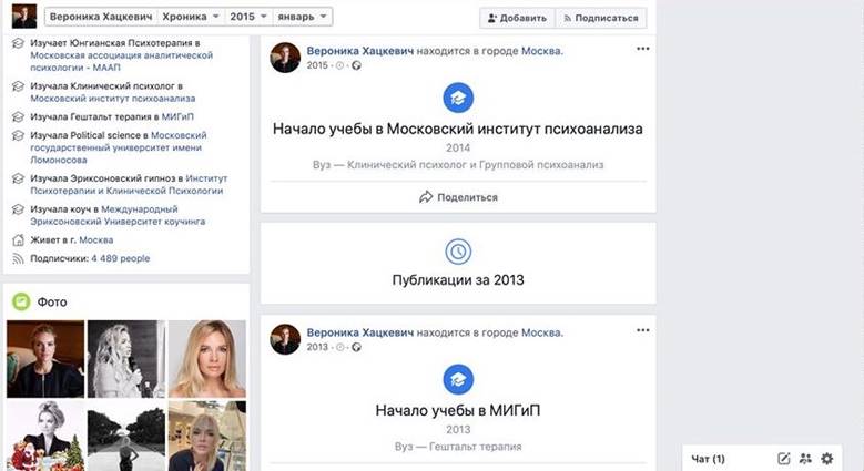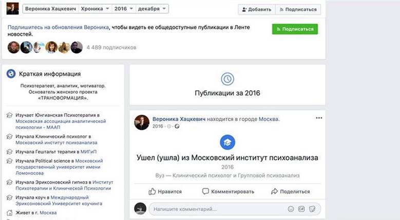 Хацкевич утверждает, что она психолог, но ни одного диплома на ее сайте нет. Единственные сведения о ее образовании можно найти на странице Facebook. Если верить им, то в 2009 году Вероника закончила МГУ, а с 2014-го по 2016 год училась в Московском институте психоанализа. Что это за двухлетняя программа обучения? То ли дневная магистратура, то ли курсы переподготовки, которые не дают права работать психологом.