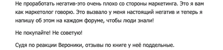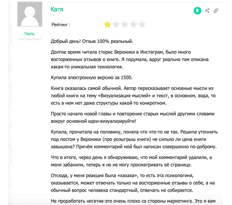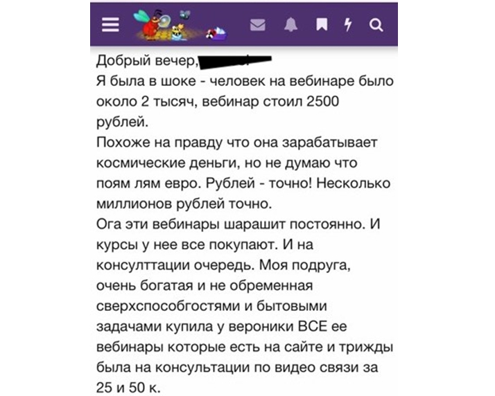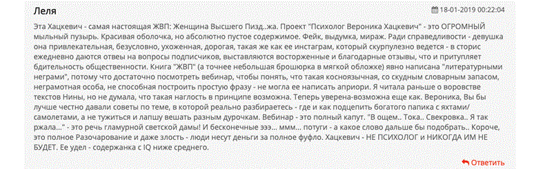«А я была у вероники. Мне не понравилось. Она надменная, не могу сказать, что умная, просто раскрученная и хайповая, все ломятся к ней, так как она транслирует лухари образ жизни и между строк говорит, что научит так же, вот все и ведутся. Я в психологии давно, как поциент, поэтому Вероника показалась мне не такой уж гуру, как себя выставляет. Есть слухи, что книгу не она писала и программу для своего курса. Склоняюсь, к тому, что это правда. Свои консультации за 25к проводит по видеосвязи, сидя на отдыхе / в кафе, связь плохая, она может обедать в этот момент или сидеть с подругой. На мой взгляд, это не профессионально, особенно учитывая стоимость. То, что она в сториз делает ответы на вопросы — молодец. Но очень часто ее ответы — это дичь», — пишет одна из ее клиенток. (Здесь и далее орфография и пунктуация авторов сохранены. — Прим. ред.)