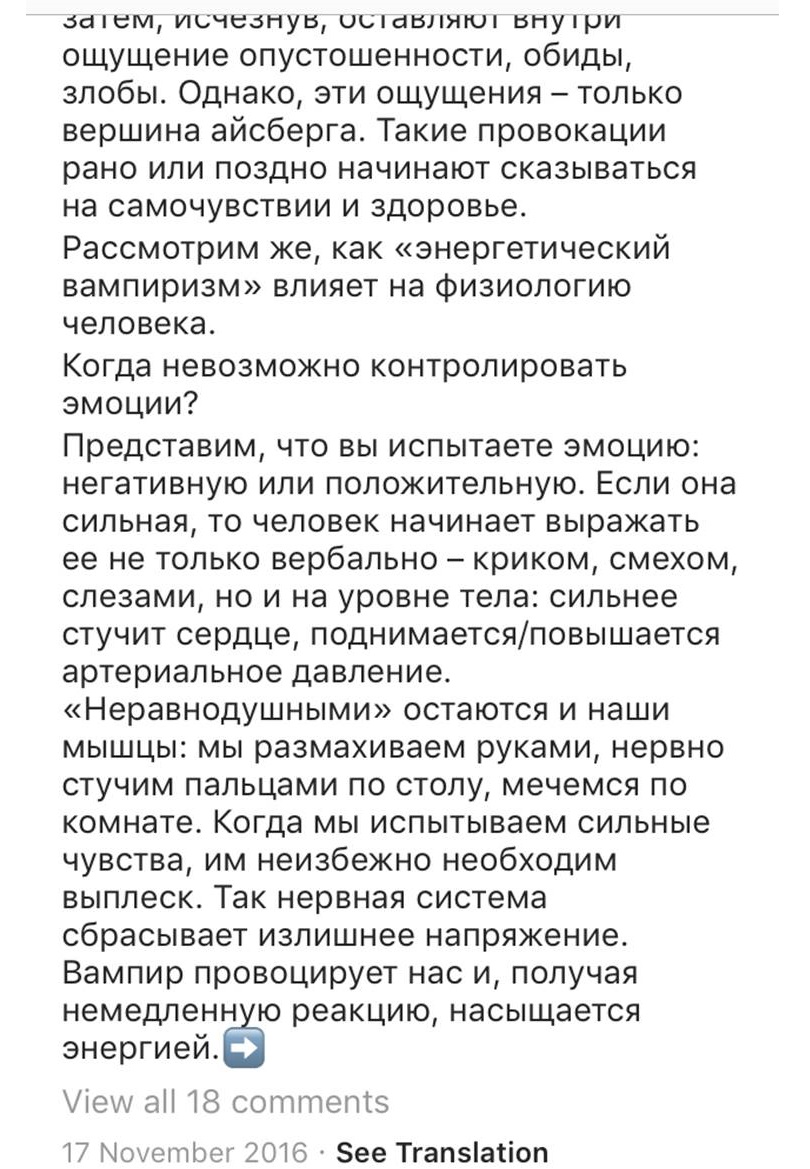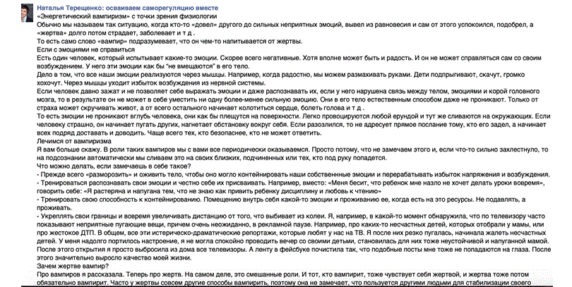 У Натальи Терещенко 13 ноября 2016 года выходит пост об энергетическом вампиризме.