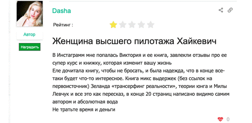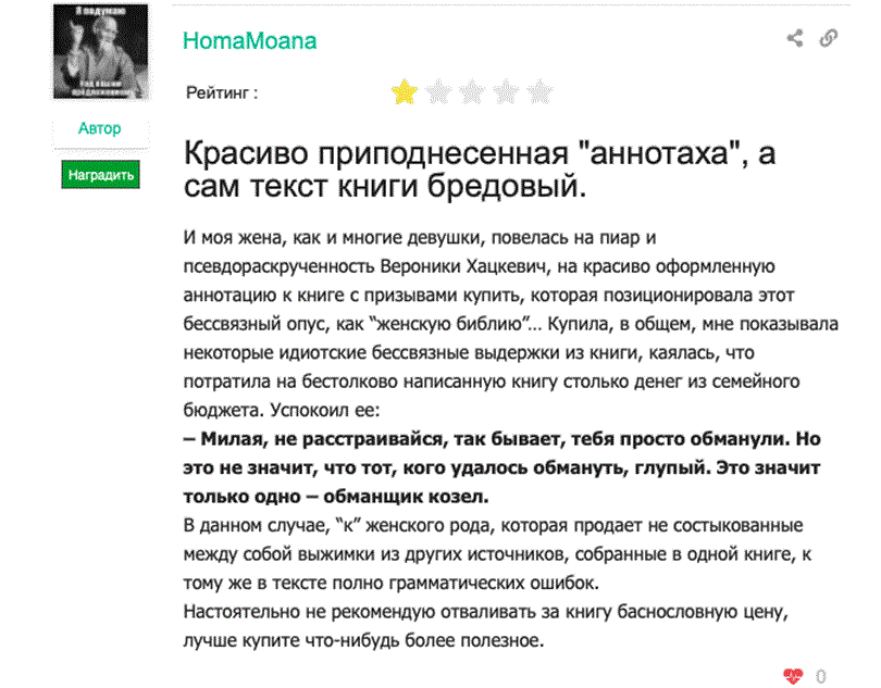 В 2018 году Вероника Хацкевич опубликовала книгу «Женщина высшего пилотажа». Если просмотреть ее вебинары, становится ясно: в книге та же самая информация (как мы уже убедились, позаимствованная у других психологов). Местами она разбавлена пересказом трудов Эрика Берна и Карла Юнга, а в конце даются бесценные советы по соблазнению мужчин. Судя по стилистике, Вероника пересказала книги еще одной героини нашей рубрики — Милы Левчук. А та, в свою очередь, переписала американских психологов 1990-х годов.