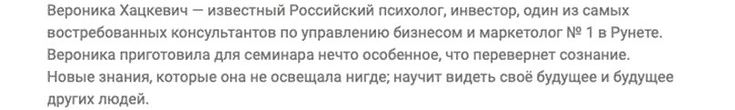 После просмотра вебинаров Вероники вопросы о ее психологическом образовании отпали сами собой. Знаете, как отличить профессионала от дилетанта? Профи можно разбудить посреди ночи — и он ответит на любой вопрос по своей специальности. Что же до Вероники Хацкевич, то она ведет свои вебинары крайне неуверенно, с запинками и заминками, в экстренных случаях вставляет научные термины типа «транзактный анализ». На комментарии не отвечает — видимо, чтобы окончательно не запутаться. А еще все время подглядывает в тетрадочку.