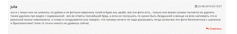 «А что касается эскорта, да, факты тут не кто сказать не может, но когда лет так 5 кто-то выложил фотки уж не помню на фб или ОК с отметкой хаца, то она ее быстро убрала. А меж тем, там было девок 5–6 в квартире, в одежде маша Цигаль или “твое” или sela (во времена когда Собчак рекламировала какой-то русский недорогой бренд, буквально масс маркет). Так вот, там стояла хац, еще 3 известные проститутки (в прямом смысле). Девки стояли в трусах включая нашу героиню вокруг 2-литрового сока Добрый в какой-то съемной квартире. И текст примерно такой: до того как еще мы не заработали свои сокровища)). А вообще, в Красноярске где она училась у нас, про Хацкевич много кто может рассказать о том как их тут с подругами снимали, и с кем и от кого переходила из рук в руки. Карьера от писательницы, фармацевта, брокера, до психолога или кто она там сейчас, это ж пц как интересно. Глубокая натура. Ах, да! Про писание картин забыла. Это наверное тож самое, как она книгу писала)) Заплатила девочке и редактору и — вуаля! Книга готова! А картины?! для благотворительности в НЙ?! Этот детдом для детишек которых она собирала деньги ей еще долго вопросы задавал в ФБ, мол, все это прекрасно, уважаемая Вероника, но мы эти деньги так и не получили))».