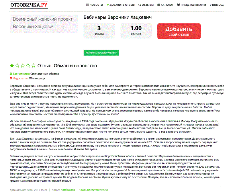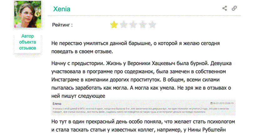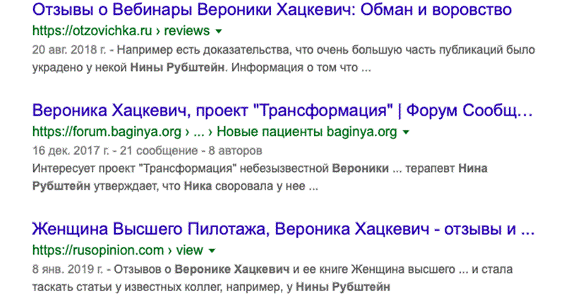 Если забить в строку поисковика «Вероника Хацкевич», Google с «Яндексом» выдают странное. Например, информацию о том, что Вероника ворует свои курсы и книги у известных психологов.
