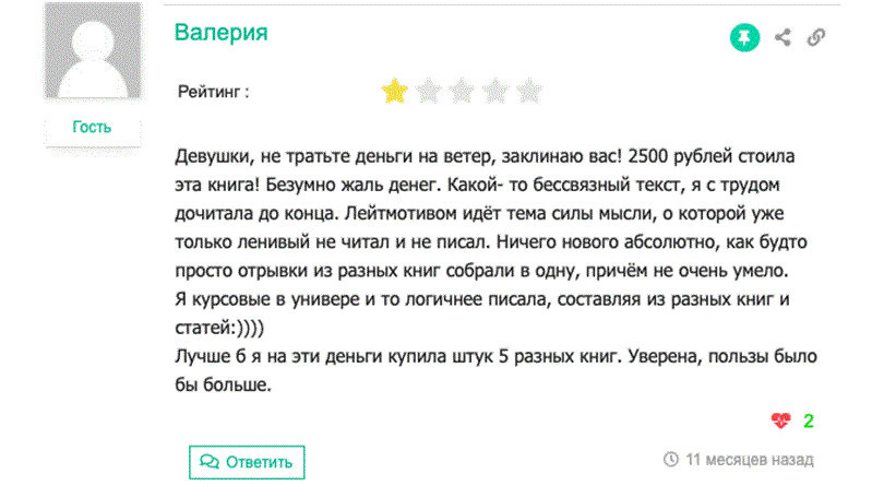 Книга в разных интернет-магазинах стоит от 1500 до 2500 рублей. От сочетания цены и содержания покупательницы рвут на голове волосы и каются, что потратили деньги из семейного бюджета. Лучше бы помаду купили.