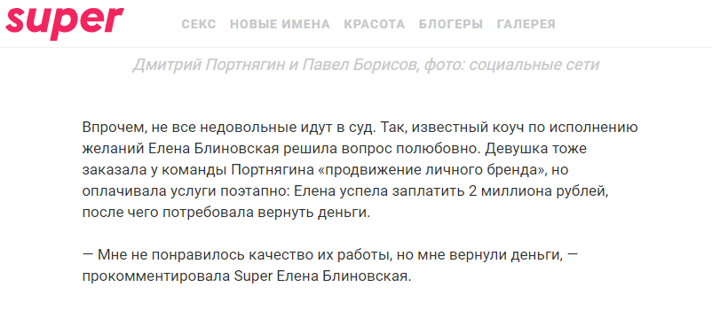 Еще одной пострадавшей от «раскрутки» Портнягиным была Елена Блиновская, которая дала свой комментарий порталу Super.