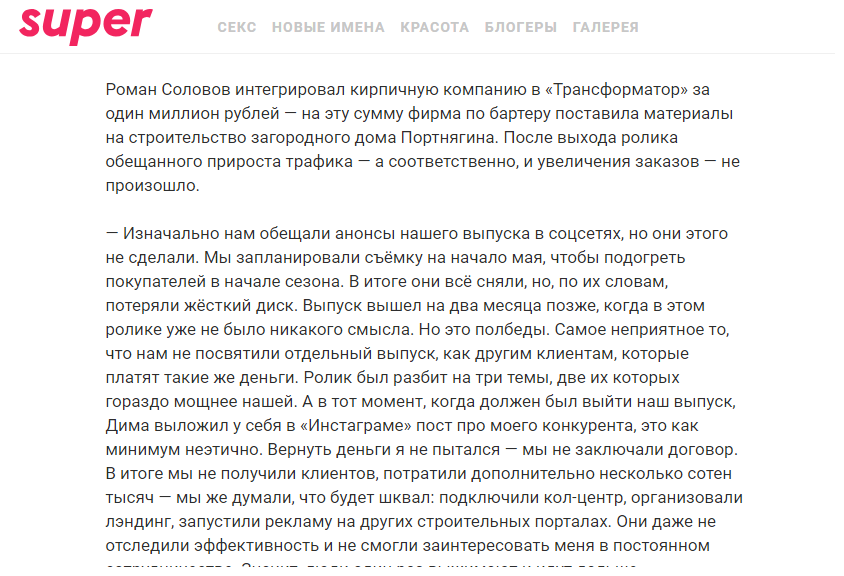 Со слов Вадима, он заказывал на канале «Трансформатор» рекламу стоимостью в 1,5 миллиона рублей. И эти деньги, говоря простым языком, были слиты, так как надлежащего качества рекламной съемки компания Вадима так и не дождалась. На канале вышло некое совершенно нелепое упоминание рекламируемой фирмы, и Вадим остался сотрудничеством крайне недоволен, о чем в подробностях рассказал в своем видео.