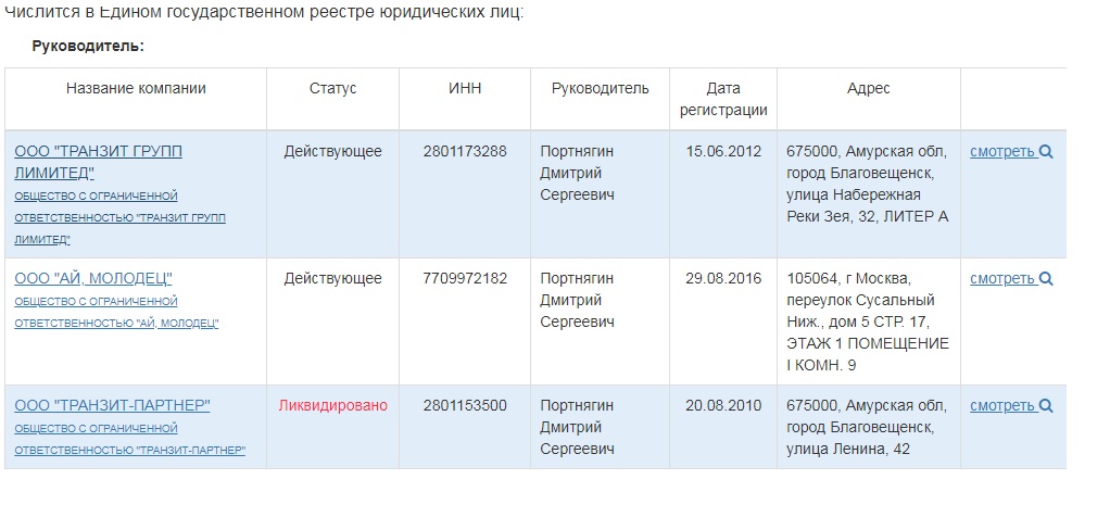 В данный момент действующими числятся две организации: «Транзит Групп Лимитед» и «Ай, молодец».