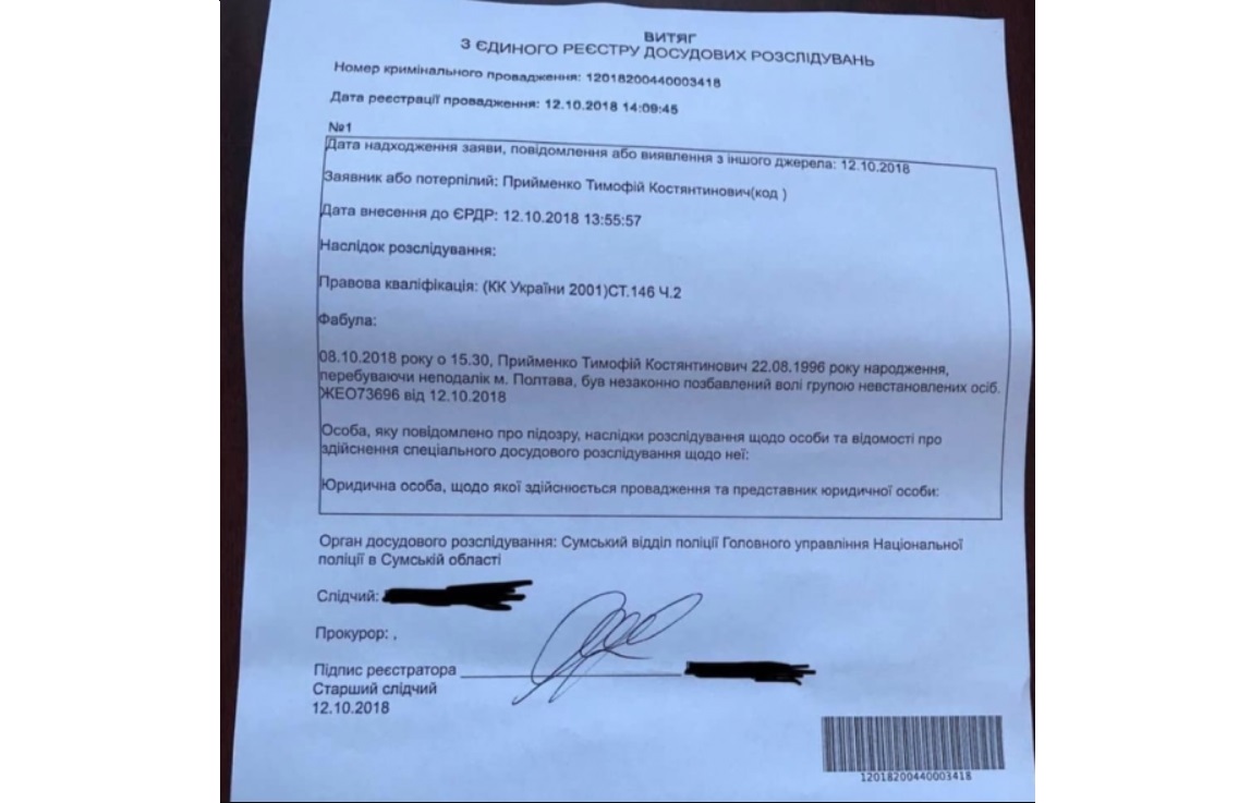 Вооруженные люди под предлогом выманили молодого парня из дома, посадили в машину и вывезли под Полтаву. Где под угрозой расправы заставили удалить весь компрометирующий контент, ролики с разоблачением Дмитрия Портнягина и записать обращение с извинениями в его адрес.