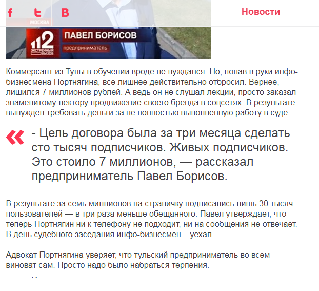 Впрочем, Иванов не единственный бизнесмен, у которого есть претензии к «гуру» Портнягину. Также намерен судиться с великим трансформатором тульский предприниматель Павел Борисов (https://mediacfo.ru/article/2018-09-21-biznes-trener-pouchil-tul-skogo-predprinimatelya-na-7-millionov).