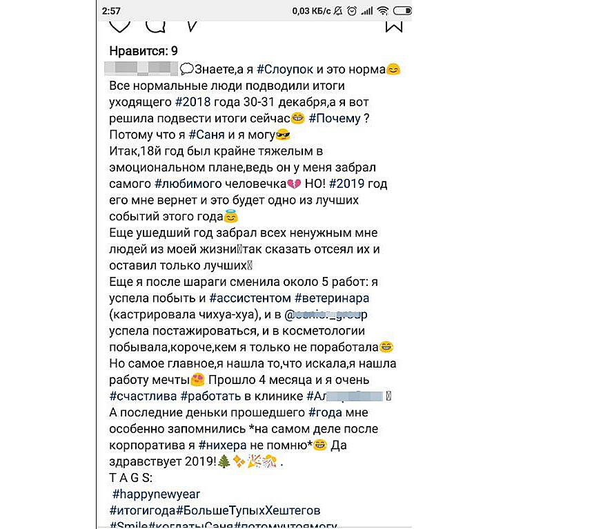 Или вот такой пример сотрудника. Девушка одним постом в Instagram обесценивает три компании, упоминая их аккаунты. Девушка-врач или девушка-медсестра в глазах клиентов уж точно не «бухая» особа, ругающаяся, как сапожник.