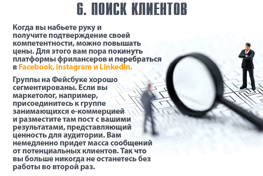 Когда вы набьете руку и получите подтверждение своей компетентности, можно повышать цены. Для этого вам пора покинуть платформы фрилансеров и перебраться в «Фейсбук», «Инстаграм» и LinkedIn.