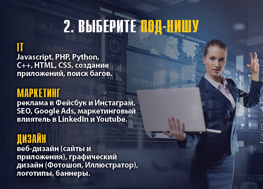 Дизайн: веб-дизайн (сайты и приложения), графический дизайн («Фотошоп», «Иллюстратор»), логотипы, баннеры.